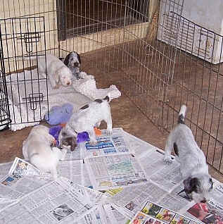 Four weeks old already! Gosh, it's hard to believe! The puppies are playing among themselves, eating well and learning to move out of the whelping box to utilize the newspaper on the floor.