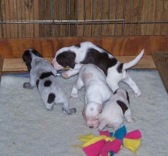 Five weeks old and the horizons are expanding. New toys and getting to play with the big dogs now. These little guys are all over the place so, even though there are only four, I still have a problem getting them all in one picture.